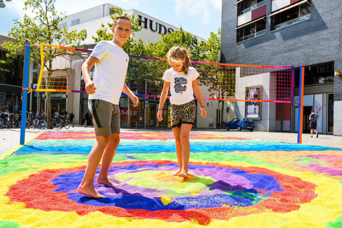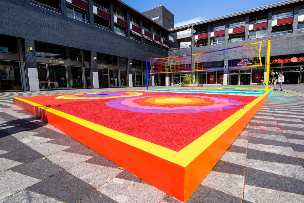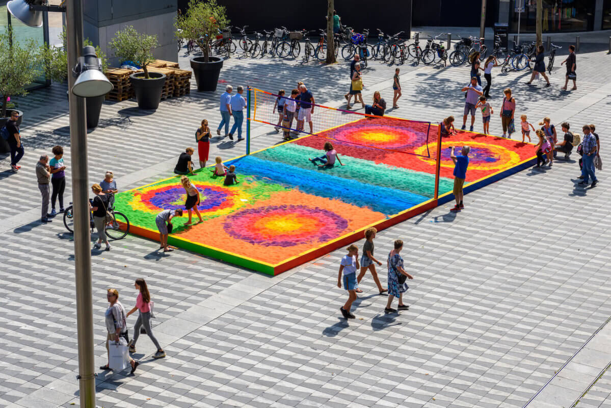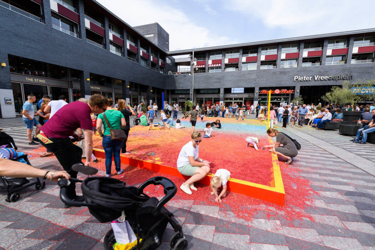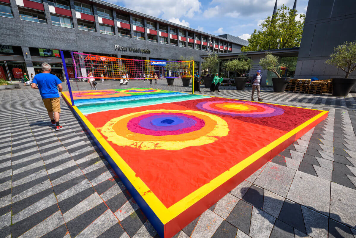 Het oppervlak van Pitch of Colored Sand bestaat uit verschillende vlakken gekleurd zand. De aanvankelijk van elkaar gescheiden kleuren raken geleidelijk aan vermengd dankzij een spel van beweging door mens, dier en de krachten der natuur. Wat ontstaat is een interactief proces waarbij nieuwe kleuren te zien zullen zijn. Spelers en toeschouwers hebben een onmisbare rol in deze permanente happening. Als kijker verander je namelijk in performer en krijg je de kans om jouw bijdrage te leveren aan de kleurrijkdom die ontstaat. Het begrip ‘publiek’ is bij Pitch of Colored Sand dus op twee vlakken aanwezig; er zijn deelnemers die actief betrokken zijn bij het spektakel en mensen die het proces observeren. Of wil je het allebei? We nodigen je in ieder geval van harte uit om op dit werk te lopen, dansen en spelen!