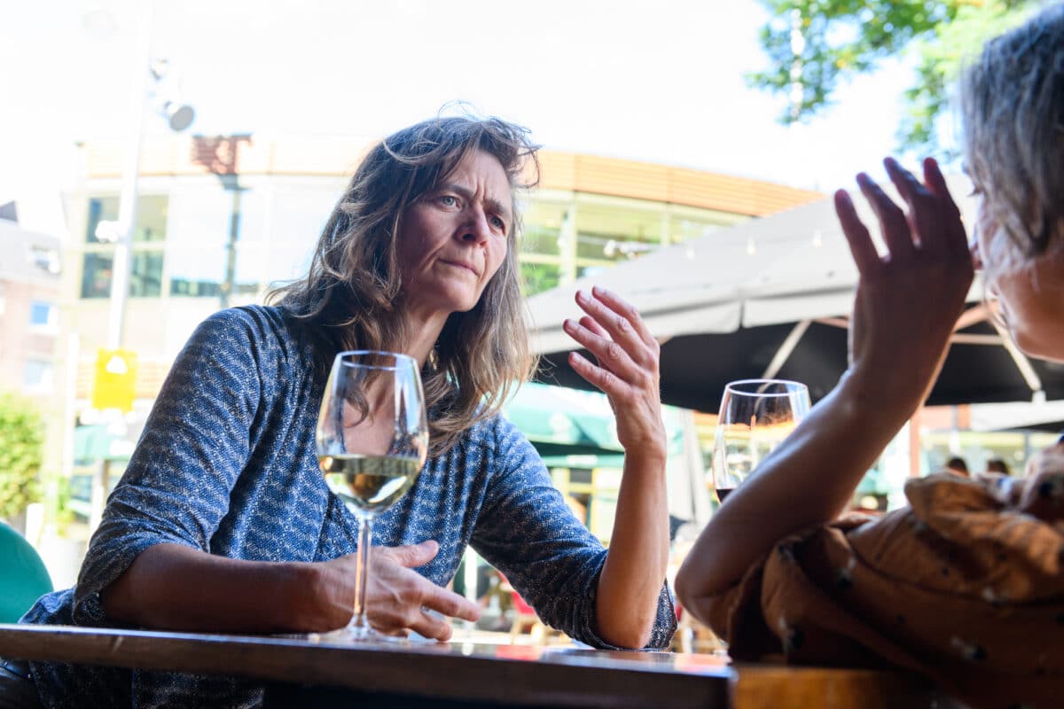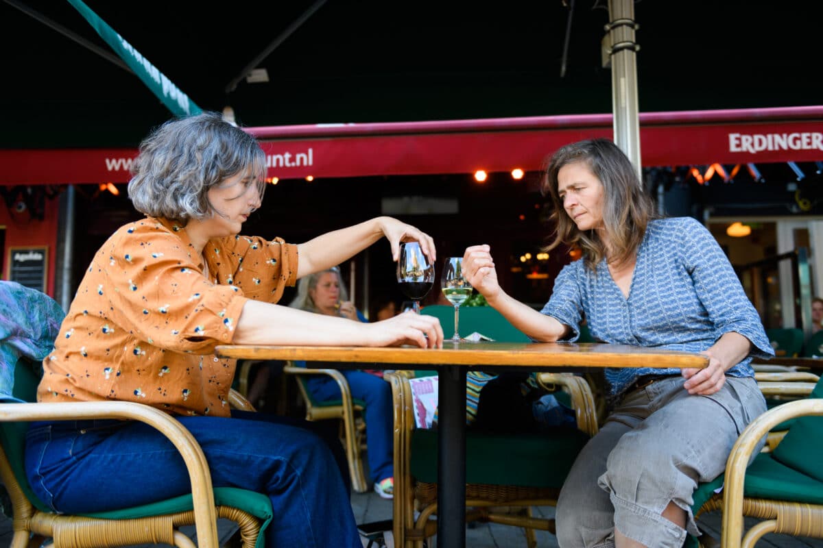 Twee mensen verheffen een doodgewoon terrasbezoekje met subtiele bewegingen tot een kunstzinnige performance.